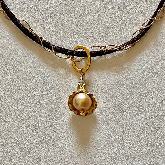 Peach Cultured Pearl & Crystal Drop Pendant on 18" Textured Oxidized Sterling Silver Chain