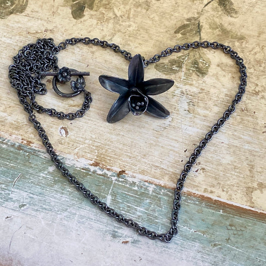 One of a kind Daffodil Necklace with Flower Toggle Clasp in Artisan-Crafted 999 Black Fine Silver