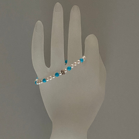 6-3/4" Stretch Bracelet with Natural Sleeping Beauty Turquoise and Soft White Cultured Freshwater Pearls