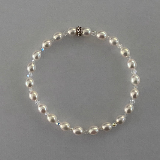 7-1/3" stretch bracelet with soft white freshwater cultured pearls and Swarovski crystal beads