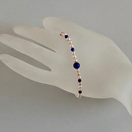 Arpaia 7.25" Stretch Bracelet with Natural Lapis Lazuli Beads, Natural Blush Pink Color Cultured Freshwater Pearls, and Handmade Sterling Silver Bali-Style Bead