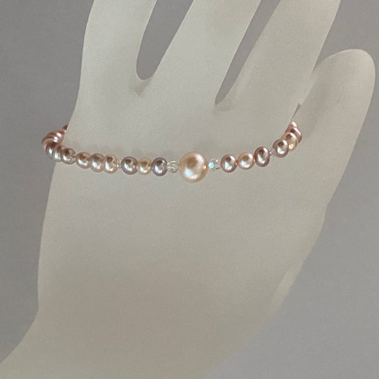 Arpaia 7" stretch bracelet with natural pastel color freshwater cultured pearls and Swarovski crystal beads