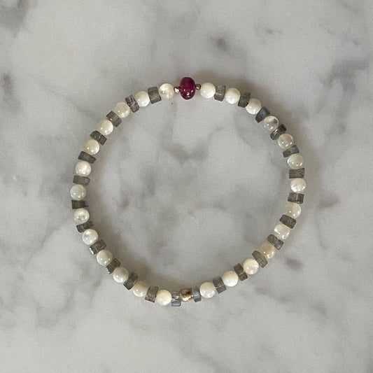7" Gemstone Stretch Bracelet with Ruby, Labradorite, and Mother of Pearl