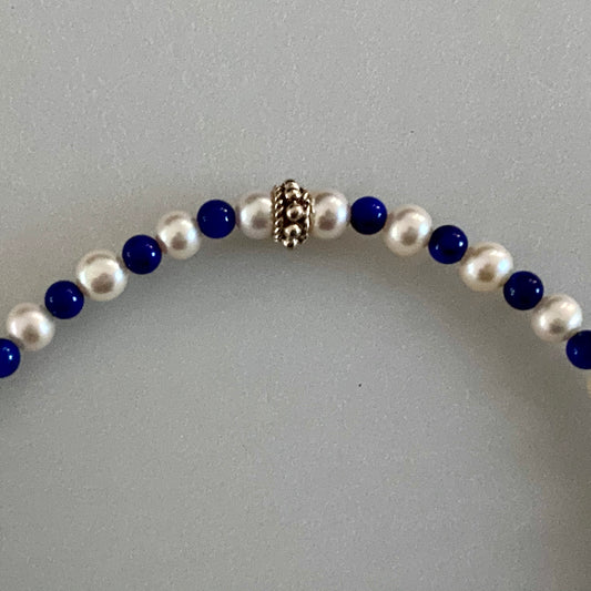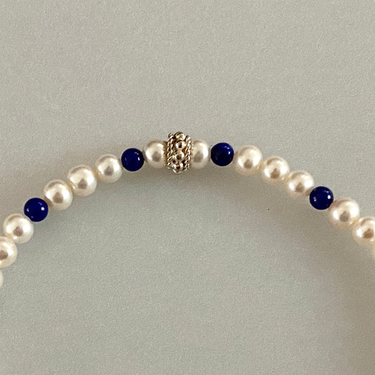 7" Stretch Bracelet with Natural Lapis Lazuli Beads, White Cultured Freshwater Pearls & Handmade Sterling Silver Bali Bead