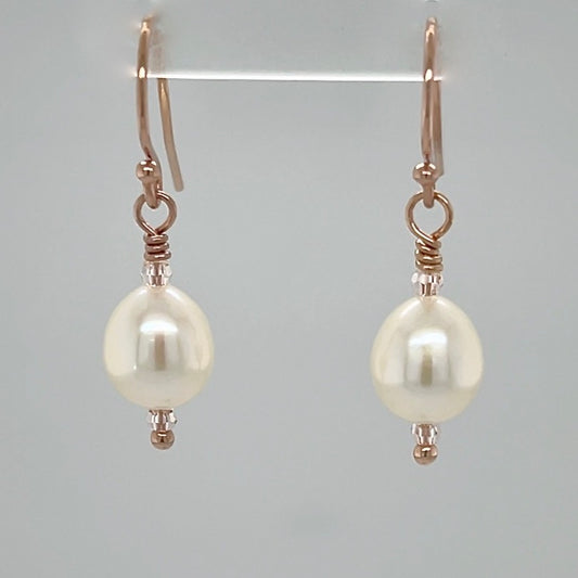Dreamy Soft White Drop Pearl Earrings with Crystal Accents in Gleaming 14K Rose Gold Filled