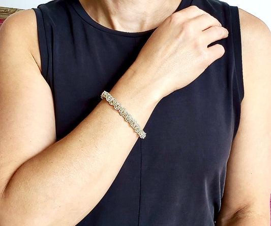 8" Handcrafted 925 Sterling Silver Frilly Bracelet with Crystal-Studded Toggle Clasp