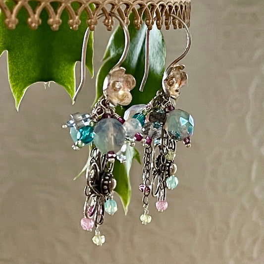 Antiqued Silver & Gemstone Flower Drop Earrings