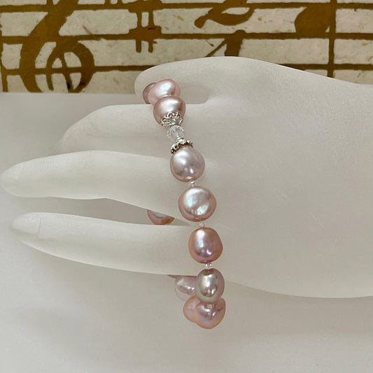 7.25" Natural Color Pink & Purple Cultured Freshwater Nugget Pearl Stretch Bracelet with Swarovski Crystal