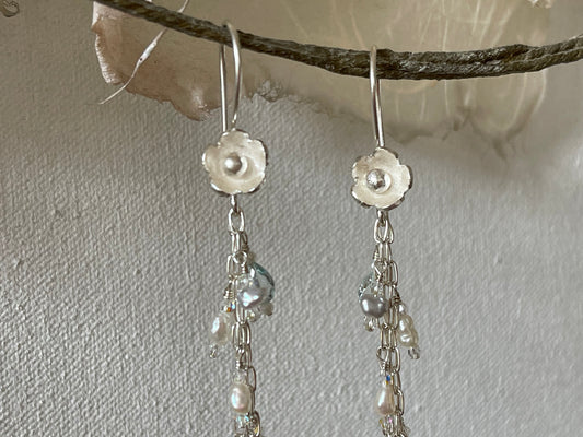 One of a Kind Fine Silver Long Dangle Earrings by Arpaia with Pearls & Aquamarine Gemstones
