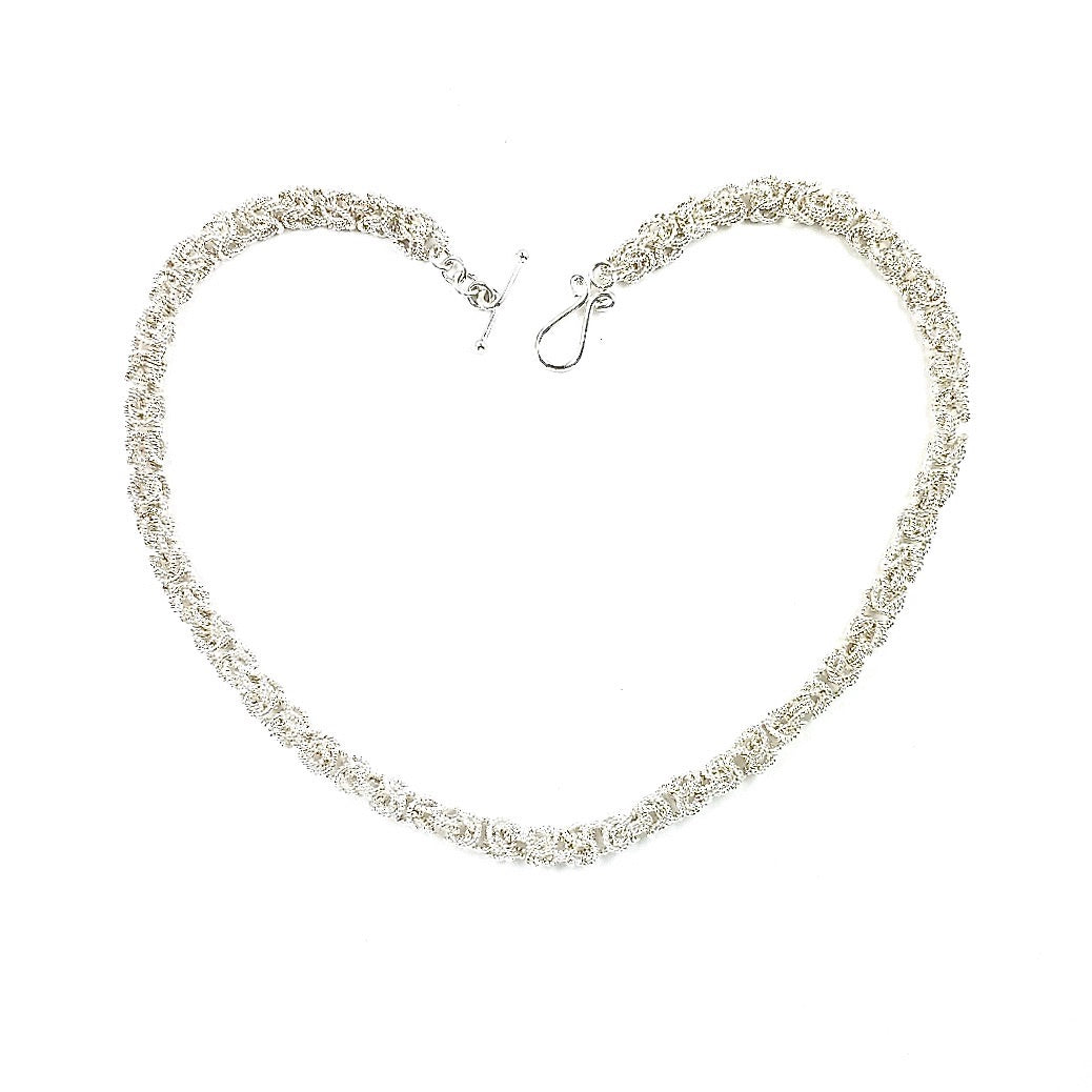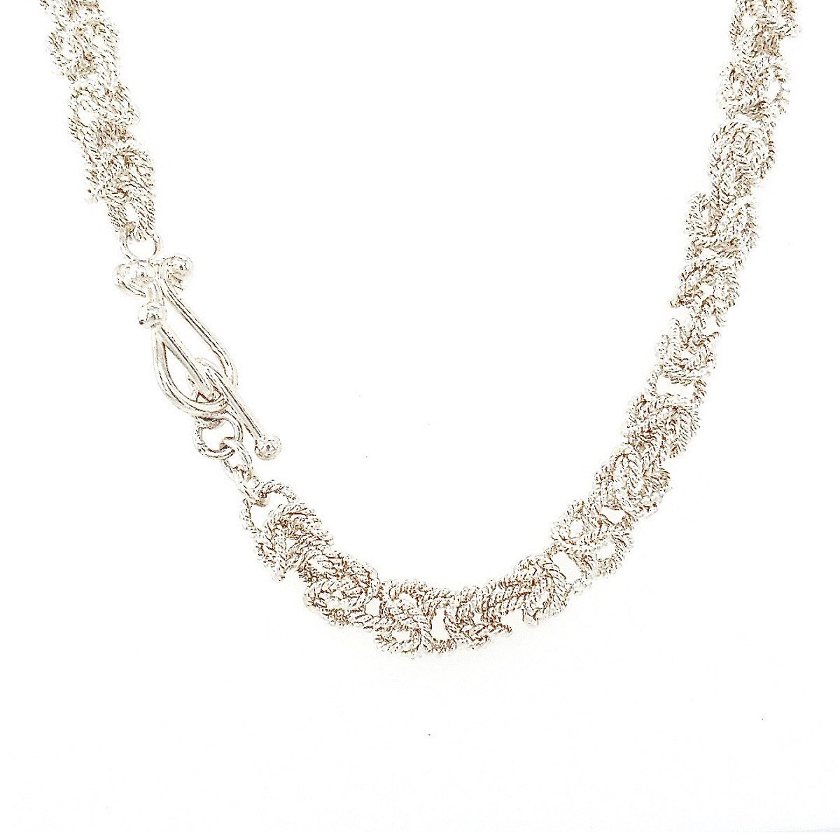 All metal is solid 925 sterling silver. After fabrication, the necklace was heavily plated with 999 pure fine silver to enhance overall beauty. The twisted rings have luxurious dual shiny-polished and matte-satin finishes and the teardrop handmade toggle clasp is smooth polished to a mirror shine.