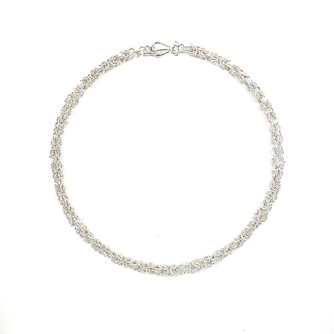 This feminine women's necklace incorporates the Byzantine link pattern and is composed of woven and fusion-welded twisted wire rings. Part of the allure of an Arpaia® Classic Collection piece is its sumptuous feel. Fluid drizzle-like drape and smooth metal work ensure comfortable wear.