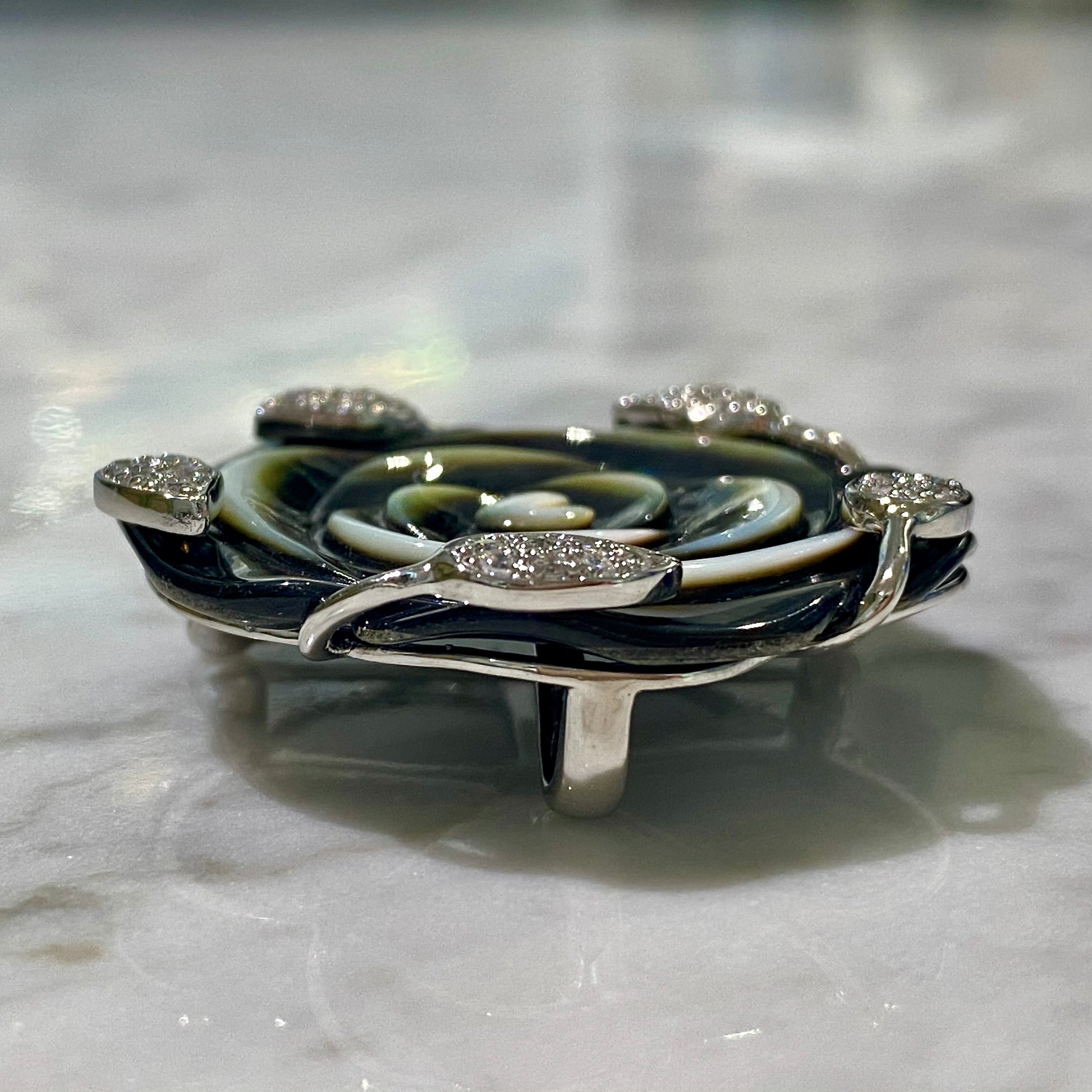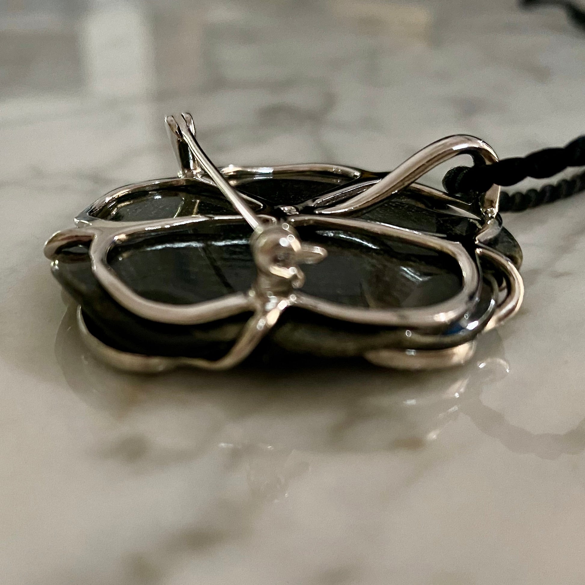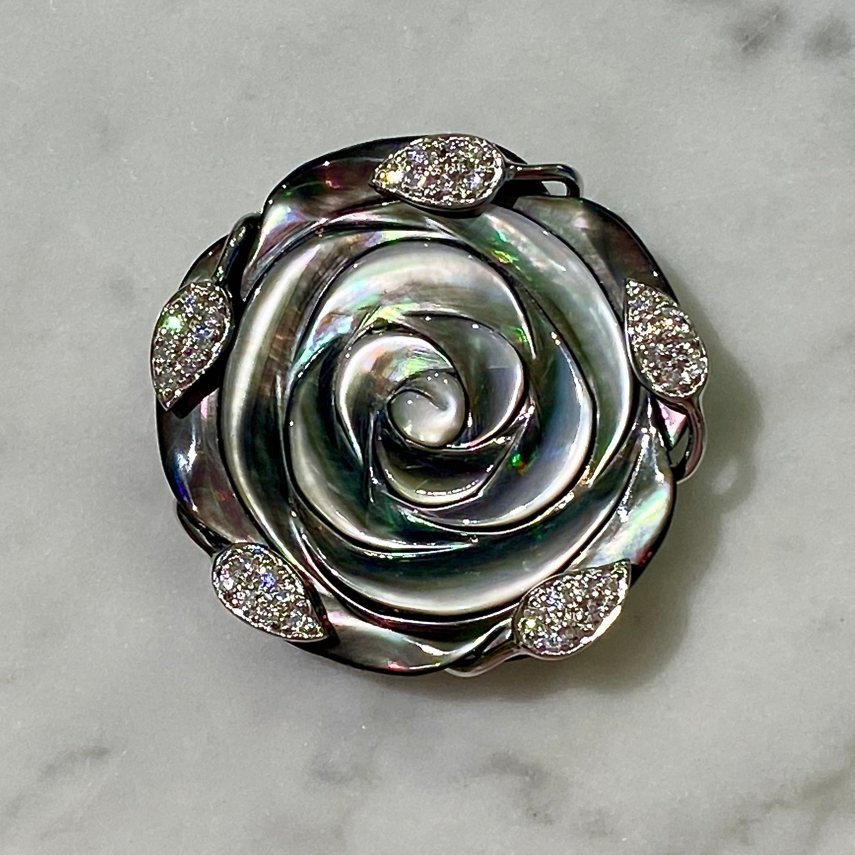 This blooming rose petal motif pendant and brooch from Hong Kong is made of gem-quality natural black mother of pearl that was hand-carved from a single black-lipped oyster shell. The raw shell and lining were polished to illuminate the billowy rainbow iridescence sometimes seen in fine mother of pearl (called "orient").