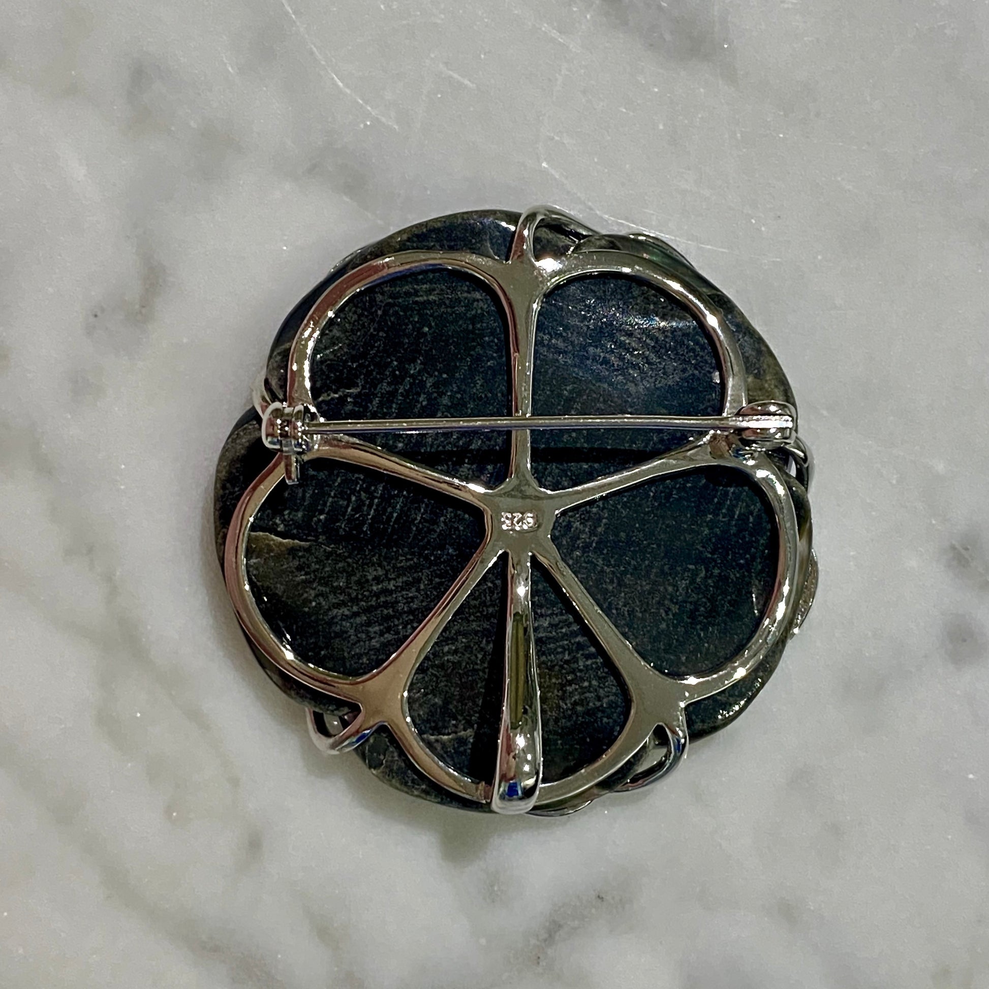 Natural Black Mother of Pearl Blooming Rose Pendant/Brooch with CZ-studded Leaves in Rhodium-Plated Sterling Silver (18" twisted black satin necklace cord included).